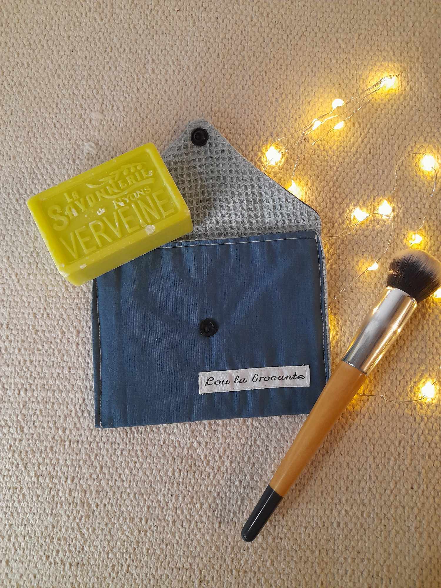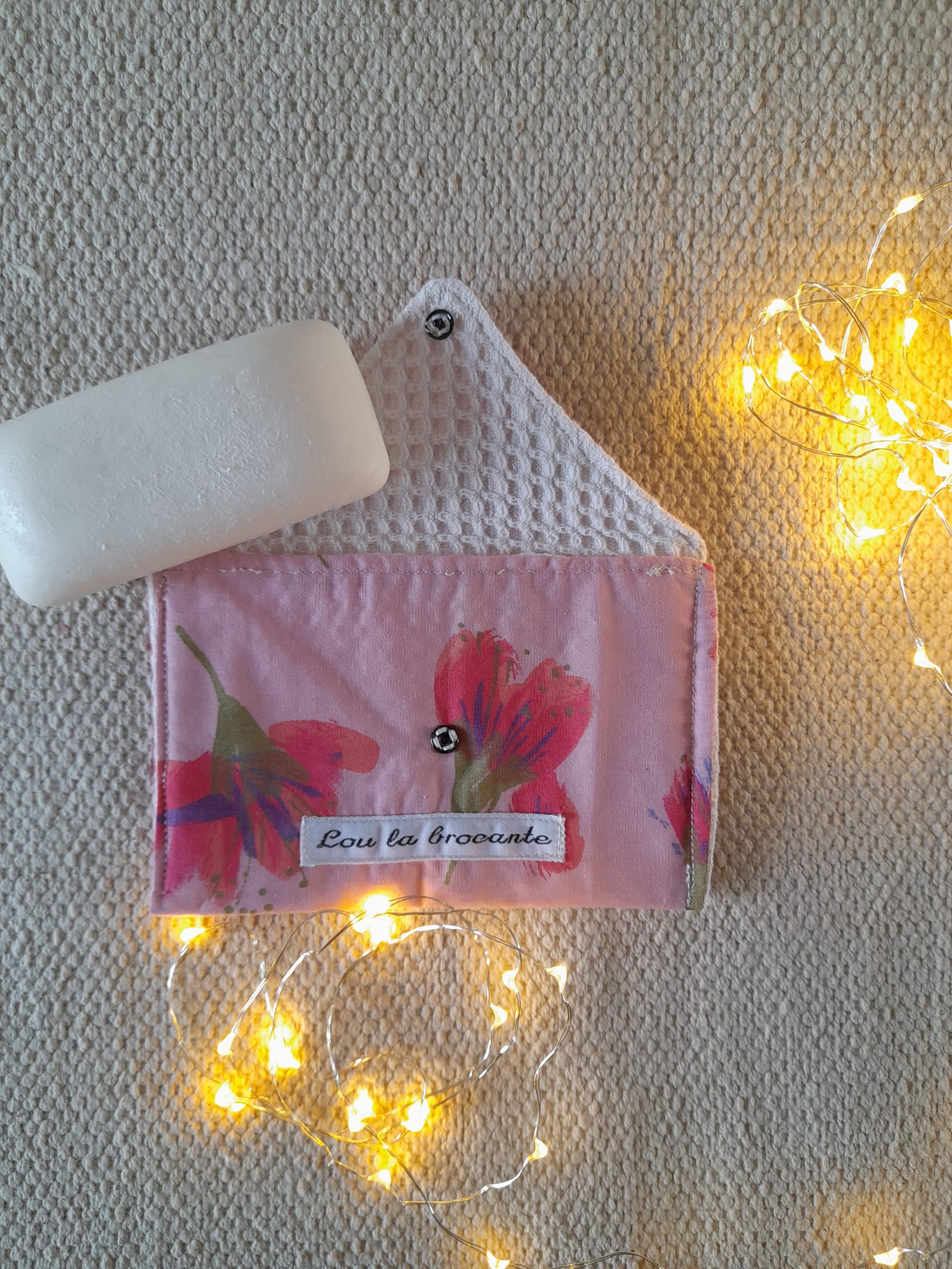 En forme d’enveloppe la pochette à savon se ferme avec un bouton pression